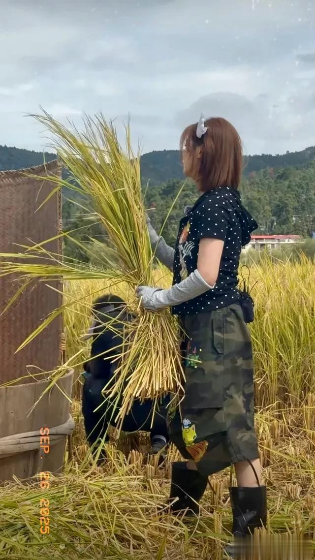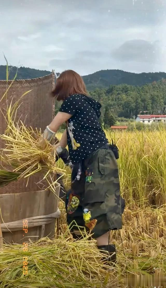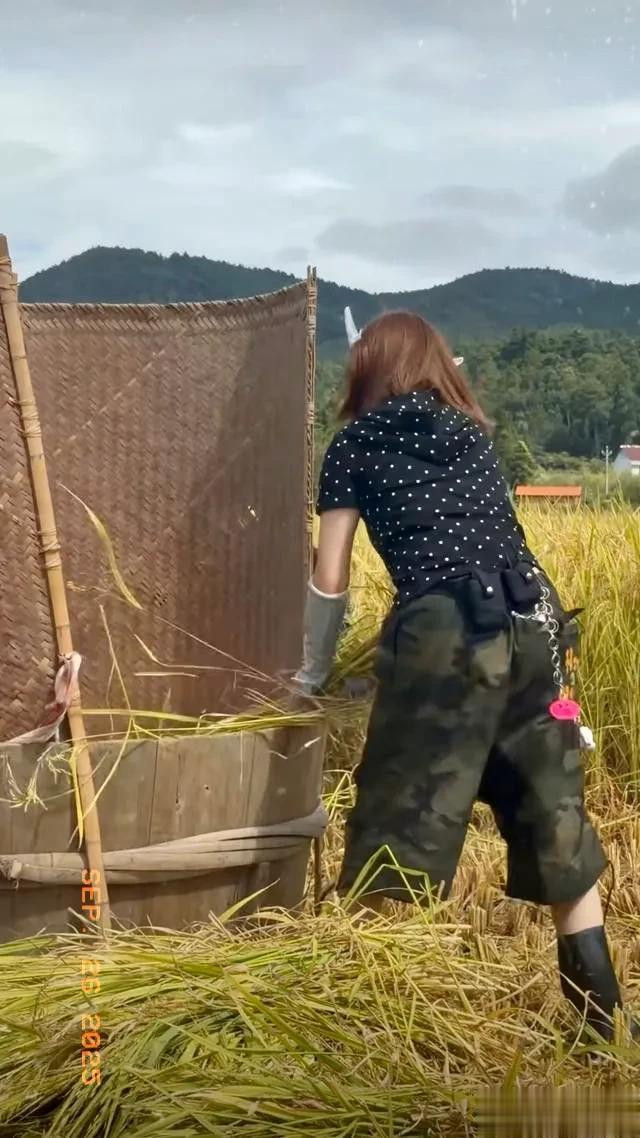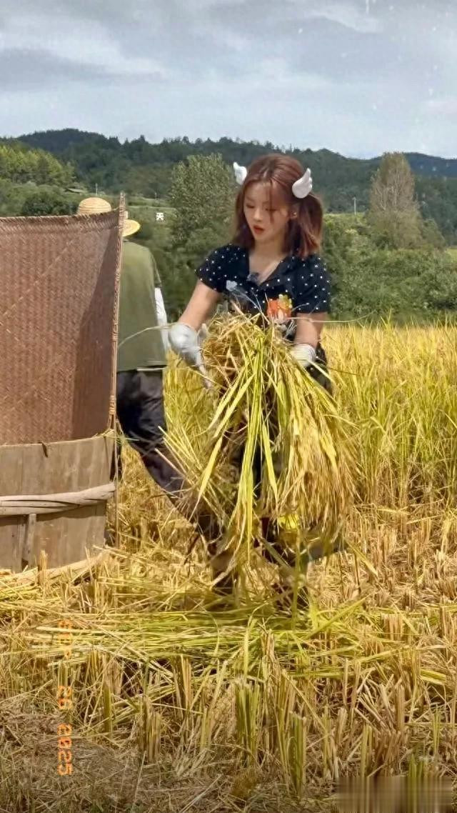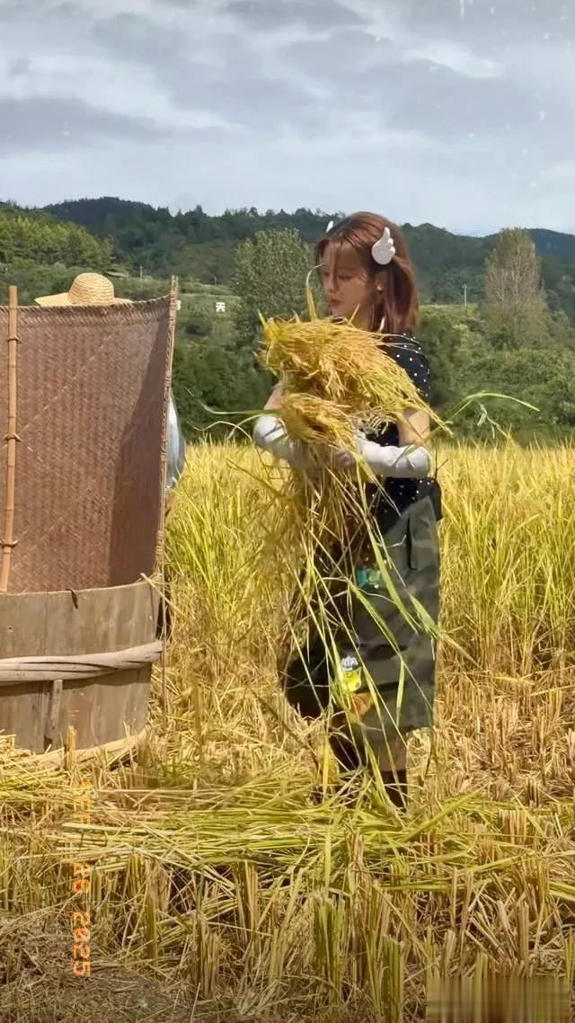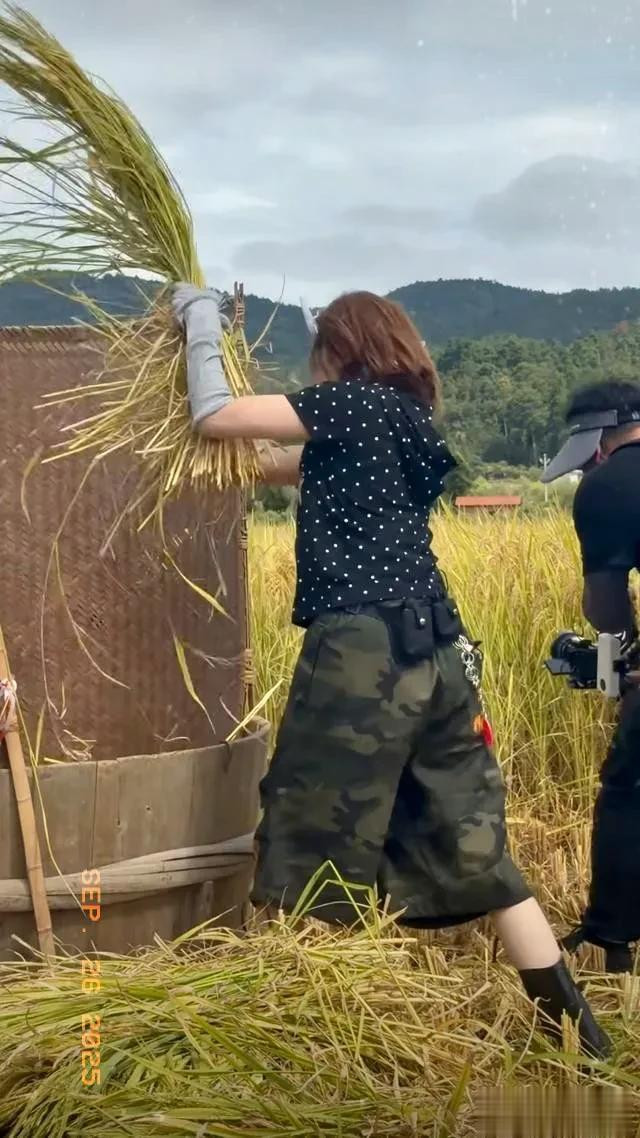 杨超越录制节目打谷子, 动作干脆利落用力甩打, 一看就是真干过活